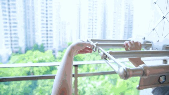 过去江家的阳台,只有两条铁杆当晾杆,晾晒的空间非常有限,还需要人力一件一件反复去挂衣服,有时候洗了床单被子,晾杆就不够用,只能在阳台找其他位置晾,阳台变成了杂乱的晒衣房,一点也不美观。