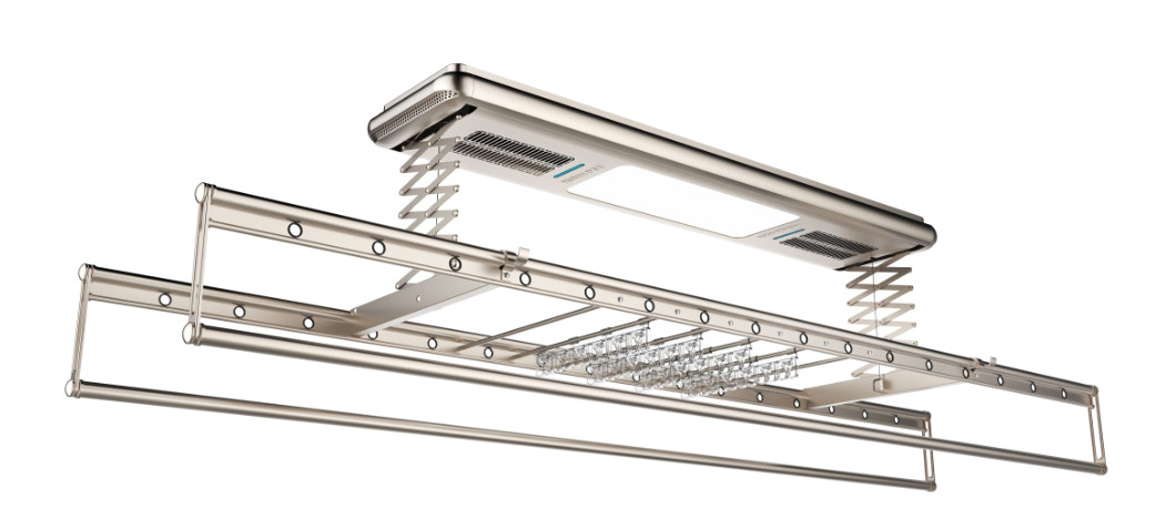 必一运动智能晾衣机集照明、风干、烘干、消毒杀菌等功能为一体,拥有4核强劲风力,超大风量,在阴雨天气下也能吹干。并且搭载着600W双核PTC陶瓷发热,高效烘干衣物,恒温不伤衣物,并且吹干烘干后会自动关闭,节能省电,对于当代社会懒癌患者简直是量身定做。再加之搭配新品被褥拍打护理仪,晾被再也不用人工进行拍打,科学健康更加简便。