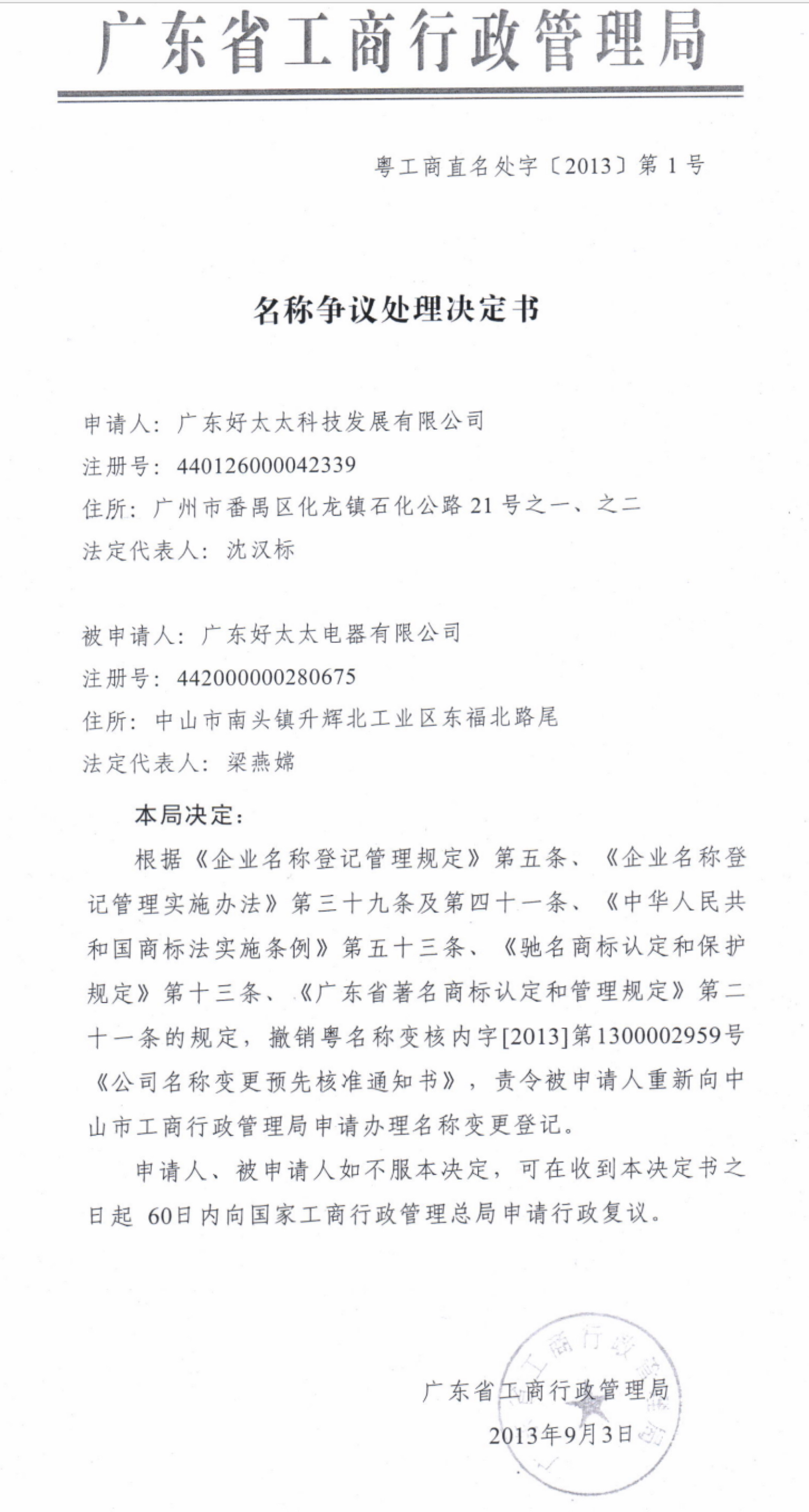 20091120日,时称中山市乐鱼电器有限公司的法定代表人老健明设立了中山市好生活电器有限公司,后于2013130日更名为中山市乐鱼电器有限公司、于2013227日更名为广东乐鱼电器有限公司。因该企业名称中再次使用乐鱼字号涉嫌不正当竞争,被广东乐鱼集团向广东省工商行政管理局投诉,于201393日被广东省工商局责令变更企业名称。
